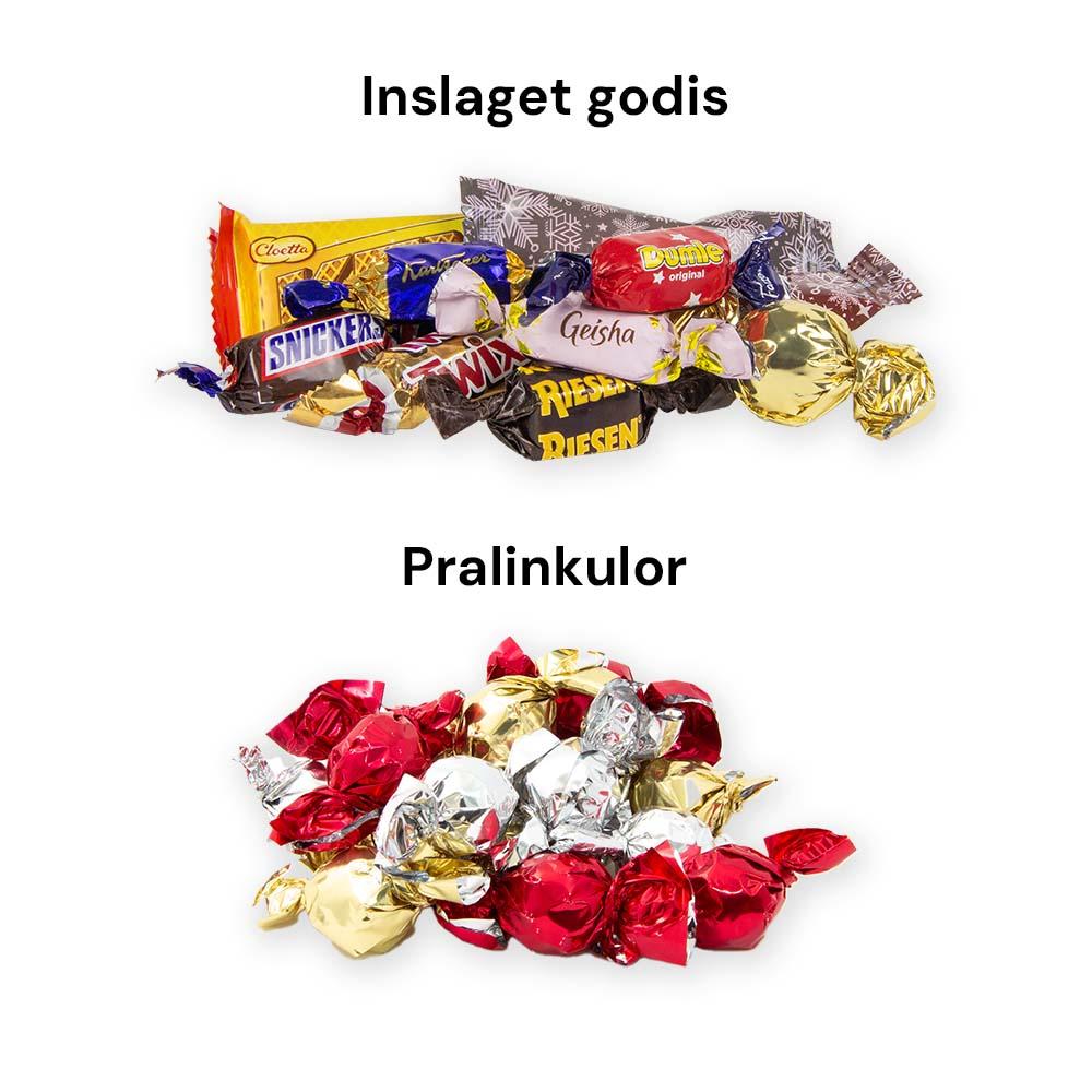 Stilren svart skål med 1,2 kg julgodis, snyggt inslagen i cellofan. Välj 100 % varumärkesgodis (Dumle, Geisha, Mars, Twix, Snickers, Plopp, Fazer Blå, Riesen m.fl.) eller belgiska pralinkulor i kakao (röd), hasselnöt (guld) och karamell (silver). Perfekt som företagsgåva.