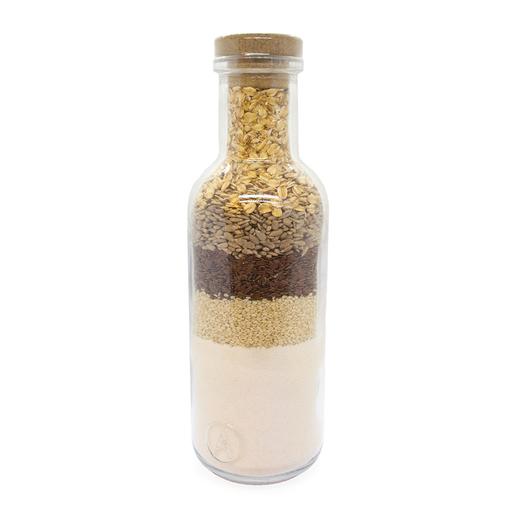 Stor glasflaska med baka-själv-kit till chia- eller knäckebröd. Tillsätt bara vatten och baka hemmagjort hårt bröd. Påskhälsning med din logotyp ingår. När innehållet är slut passar den perfekt som vattenkaraff.