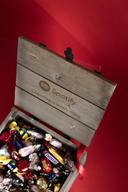 Charmig trälåda fylld med 1,5 kg inslaget varumärkesgodis (Dumle, Geisha, Mars, Twix, Snickers, Plopp, Fazer Blå, Riesen m.fl.) eller belgiska pralinkulor i smakerna kakao (röd), hasselnöt (guld) och karamell (silver).