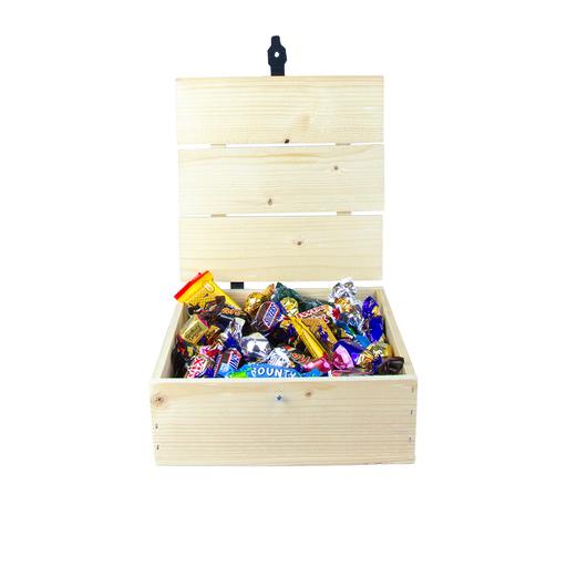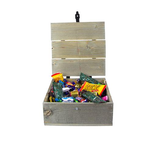 Charmig trälåda fylld med 800 g inslaget varumärkesgodis (Dumle, Geisha, Mars, Twix, Snickers, Plopp, Fazer Blå, Riesen m.fl.) eller belgiska pralinkulor i smakerna kakao (röd), hasselnöt (guld) och karamell (silver).