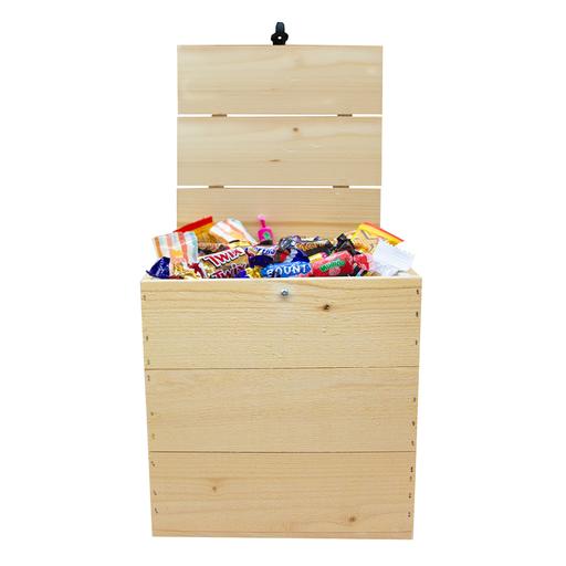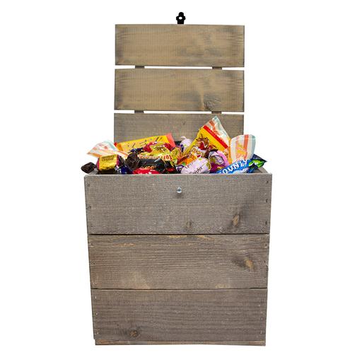 Trälåda fylld med 2,5 kg inslaget varumärkesgodis (Dumle, Geisha, Mars, Twix, Snickers, Plopp, Fazer Blå, Riesen m.fl.) perfekt till påsken. Välj mellan en ljust trä eller drivved alltid med ett självstående lock.