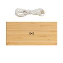 Väckarklocka med utsida i bambu, 24 timmar tidsindikator och med 5W trådlös laddning. Med USB-port på bakdsidan för laddning via kabel. Kompatibel med alla QI-aktiverade enheter som senaste generationen Android, iPhone 8 och upp. Input: 5V/1.5A; trådlös Output: 5V/1A - 5W; 1 USB output port, 5V/1A. 150cm lång PVC-fri micro USB kabel i TPE medföljer. Beställ väckarklocka med trådlös laddning och tryck.